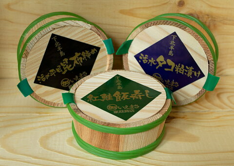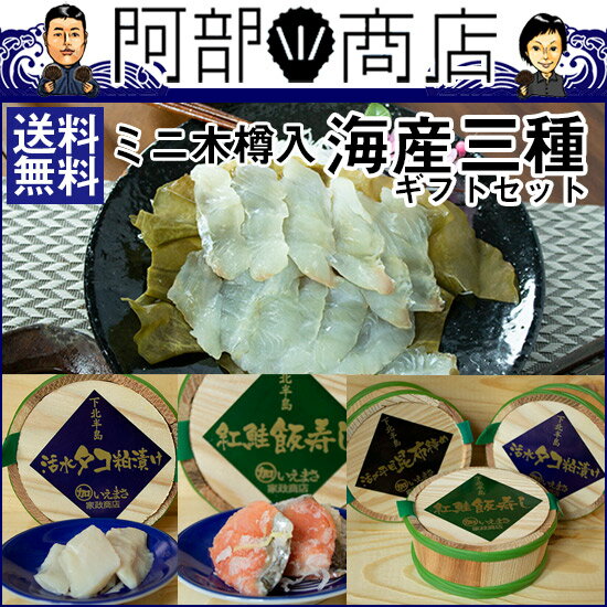 【送料無料】【ミニ木樽入り】紅鮭飯寿し・平目昆布〆・タコ粕漬け 各100gセット 【父の日ギフト】【お中元】【お歳暮】【敬老の日】